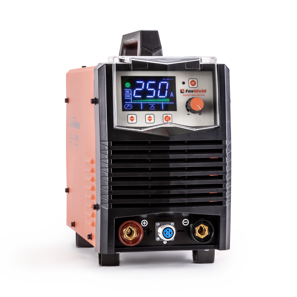 Сварочный аппарат SAGGIO ММА 250 SYN с синергетическим режимом управления предназначен для ручной дуговой сварки (ММА) любыми типами электродов и выполнен по новейшей IGBT технологии, позволяющей добиться минимального веса и габаритов. SAGGIO ММА 250 SYN отличается надёжностью, хорошими техническими характеристиками, имеет программно-установленные функции AntiSticking (антизалипание), регулируемые Нot Start (горячий старт) и Arc Force (форсаж дуги), и устойчиво работает при понижении напряжения сети, что делает аппарат более универсальным и практичным. Синергетическая система управления позволяет легко и быстро настроить аппарат по диаметру сварочного электрода. Дополнительный режим TIG LIFT позволяет проводить аргонодуговую сварку на постоянном токе изделий из черной и нержавеющей стали, меди, титана, чугуна. Данный вид сварки характеризуется отсутствием брызг и более презентабельным внешним видом сварного шва. Для проведения аргонодуговой сварки необходимо дополнительно приобрести горелку с вентилем, баллон с газом и присадочную проволоку.