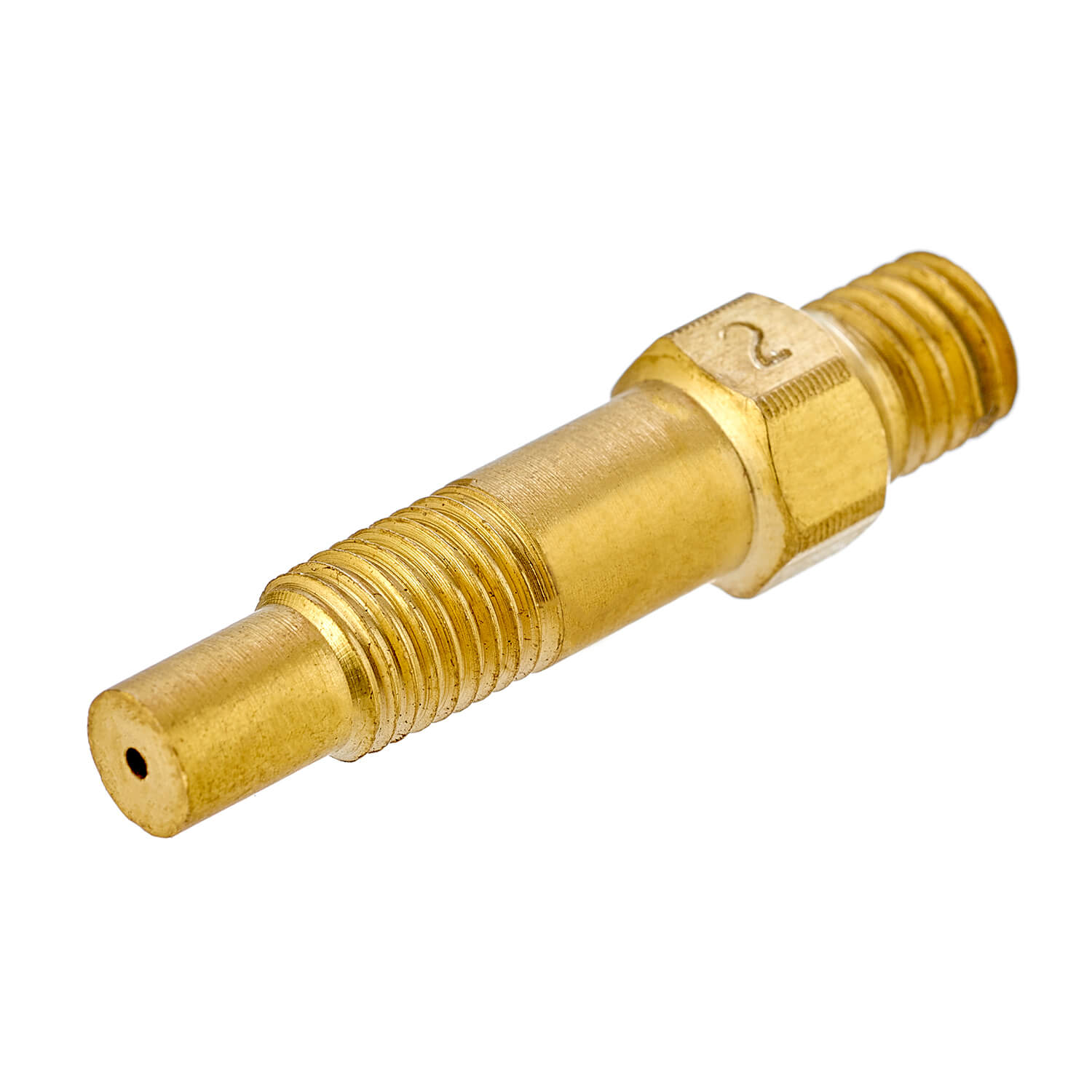 Латунный внутренний мундштук №2 для бензинового резака РБ-02 (тип «Луч»). Толщина разрезаемого металла 15–30 мм. Мундштук присоединяется к катушке резака РБ-02 при помощи резьбы М8х1 мм, а к самой головке резака при помощи наружной резьбы М8х1,25.