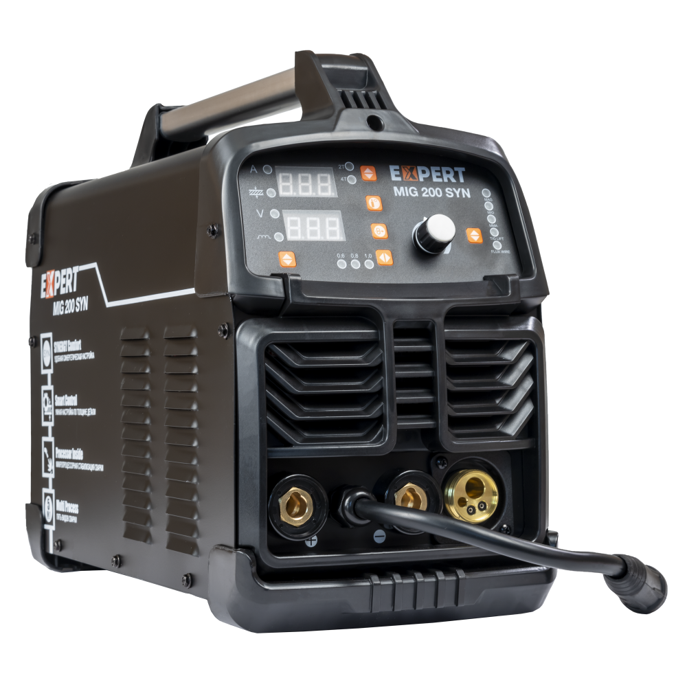 Сварочный полуавтомат EXPERT MIG 200 SYN — это инверторный источник питания с синергетическим режимом управления, позволяющий производить сварку, используя инверторную технологию преобразования и управления сварочным током. При этом аппарат обеспечивает идеальные параметры сварки даже при большом падении входящего напряжения, особенно на малых токах, при сварке небольших толщин. Аппарат позволяет проводить полуавтоматическую сварку (MIG/MAG) сплошной проволокой в среде защитного газа, полуавтоматическую сварку (FLUX WIRE) самозащитной проволокой без использования защитного газа, ручную дуговую сварку (ММА) на постоянном токе штучным электродом с рутиловым и основным покрытием и аргонодуговую сварку (TIG Lift) на постоянном токе с возбуждением дуги касанием вольфрамового электрода. Два цифровых дисплея на панели управления отображают значения сварочного тока, напряжения и параметров сварки.