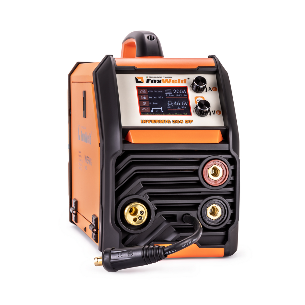 Сварочный инверторный полуавтомат FOXWELD INVERMIG 200 DP с синергетическим управлением предназначен для сварки проволокой MIG/MAG в импульсном и обычном режимах, а также может работать в режимах аргонодуговой сварки TIG и ручной сварки ММА. INVERMIG 200 DP — многофункциональный сварочный аппарат с двойным импульсом, высокой продолжительностью нагрузки, в нём предусмотрены выбор и сохранение программ и различные режимы управления горелкой. Конструкция аппарата имеет 2-роликовый полноприводный механизм подачи проволоки, интеллектуальную систему вентиляции, информативный жидкокристаллический дисплей. В аппарате предусмотрена розетка на 36 В для подключения подогревателя газа.