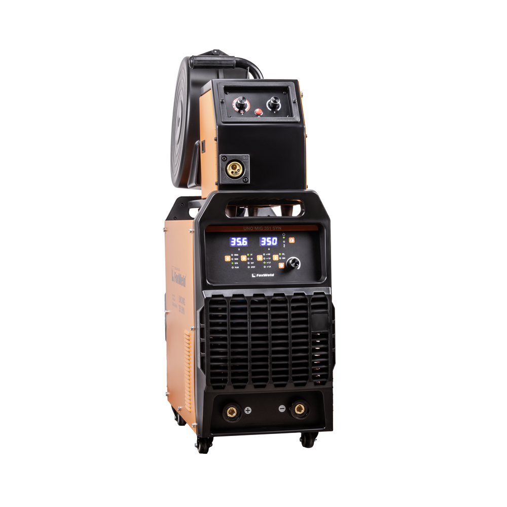FOXWELD UNO MIG 351 SYN – промышленный/профессиональный трёхфазный инверторный сварочный полуавтомат. Аппарат имеет защиту от перегрузки, индикатор перегрева и неисправности, отличается высокой стабильностью сварки в реальном времени, простым интуитивно понятным управлением сварочными параметрами. UNO MIG 351 SYN с синергетическим управлением предназначен для широкого использования в отраслях по производству металлоконструкций, в сервисных металлоцентрах, при ремонте и восстановлении. Сварочный источник позволяет производить сварку изделий из низкоуглеродистой и легированной стали и алюминия. Максимально надёжная сварочная установка с отдельным 4-роликовым полноприводным механизмом подачи проволоки, двумя мощными ручками на корпусе и колёсами для перемещения идеально подойдёт для рабочего места сварщика. В механизм подачи сварочной проволоки можно установить катушки диаметром D200, D300.